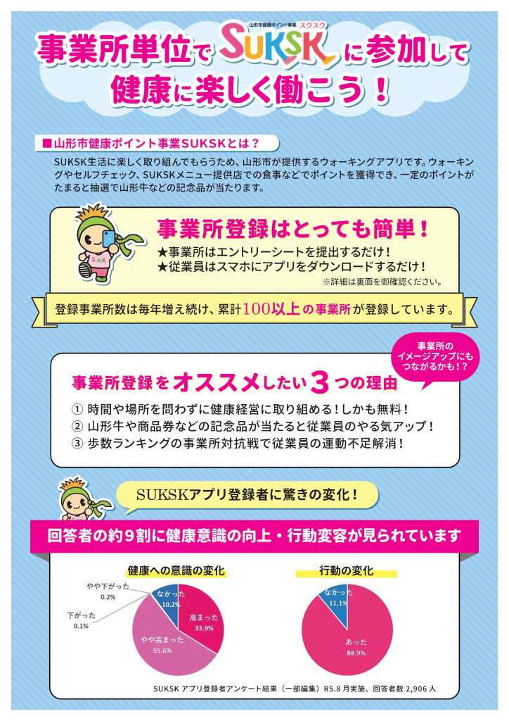 山形市では、従業員の健康管理を企業の成長戦略として捉える「健康経営®」について、健康ポイント事業SUKSKの事業所登録を通じて従業員の健康づくりを支援しており、市内100社以上でSUKSKアプリを活用いただいております。