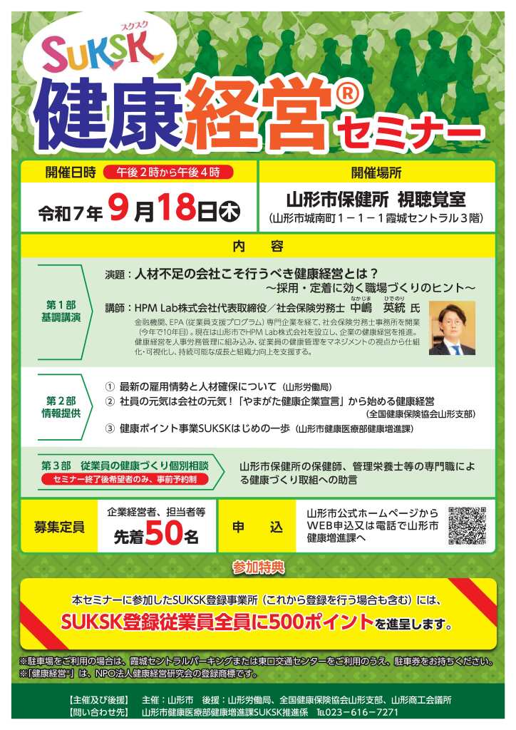 このたび、健康経営の概念のさらなる普及を図るとともに、企業によるSUKSKアプリの活用を促進し健康医療先進都市の確立を目指すため、新たに、山形労働局様、全国健康保険協会山形支部様、山形商工会議所様の後援を受けてSUKSK健康経営セミナーを開催しました。